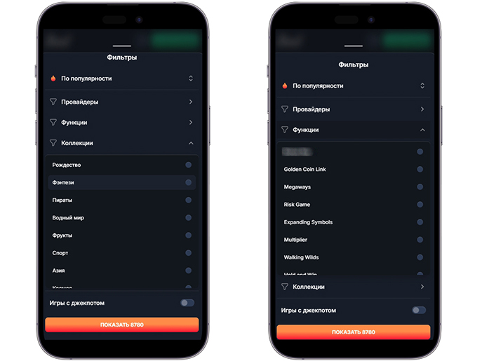 - Слоты: с фильтрами по Bonus Buy, Megaways, Hold&Win, Risk Game;