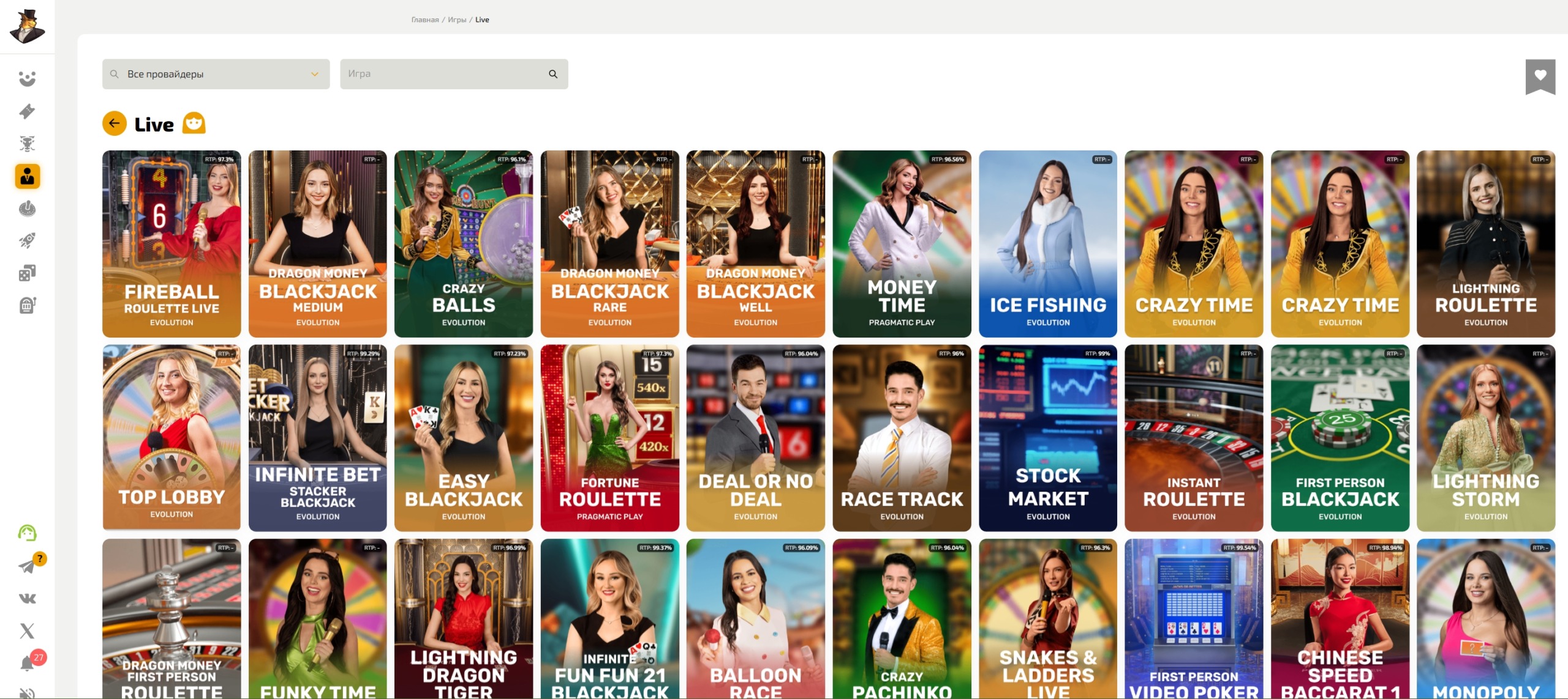 📺 Live-раздел представлен студиями Evolution Gaming и Pragmatic Play Live: